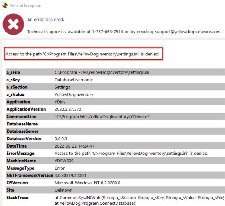 Figure 1. Access to path 'C:\Program Files\YellowDogInventory\settings.ini' is denied error message.