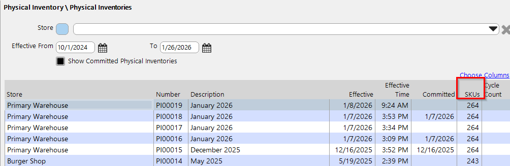 Figure: Example of where to find the number of SKUs included in a Physical Inventory