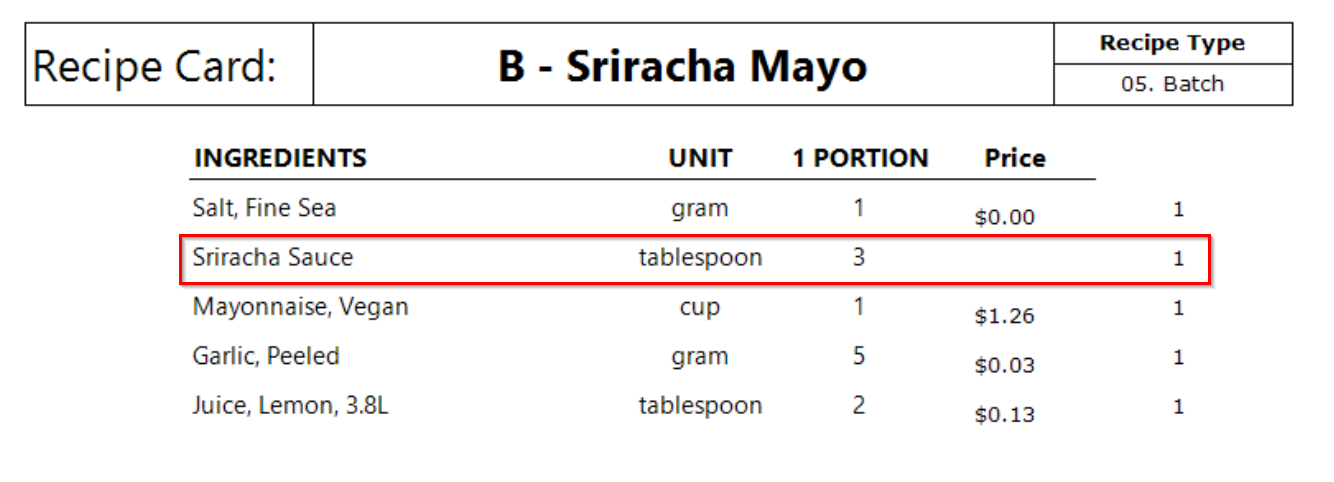 Figure: Example of a recipe card printed without a cost because no on-hand adjustments exist for the selected store.