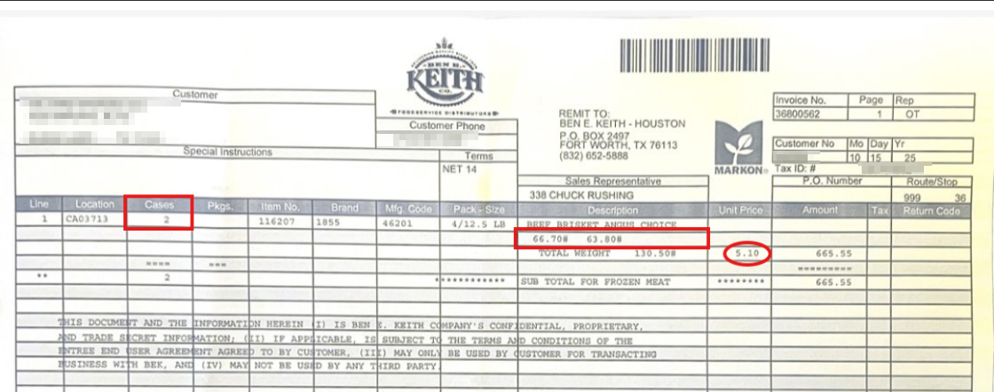 Figure: Example invoice displaying both the Case Column and the true weight of each case in the description column
