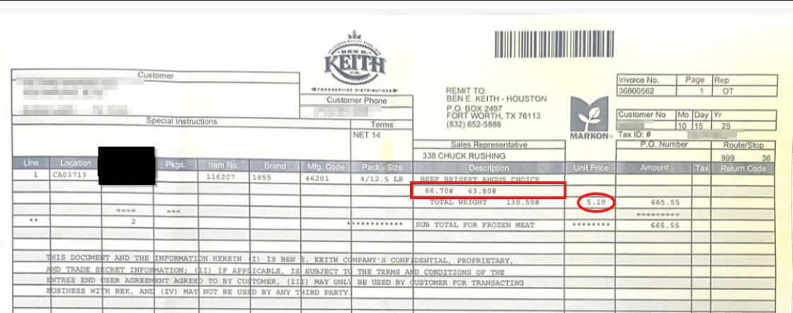 Figure: Example invoice with the Case Column redacted leaving the true weight of each case visible