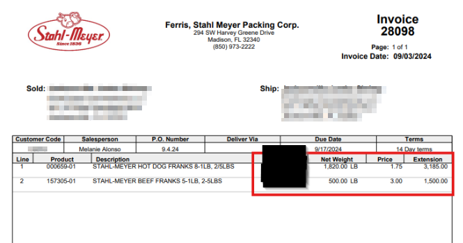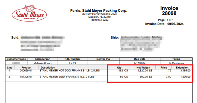 Yes. Stahl-Meyer invoices include two quantity fields: a Quantity column and a Net Weight column. When an invoice contains catch-weight items (items sold by weight rather than by a fixed unit such as a case or box), Retriever cannot determine which quantity value to use.
