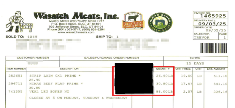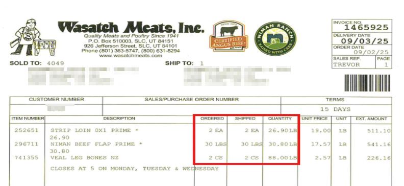 Figure: Example Wasatch Meats invoice showing all three columns for quantity