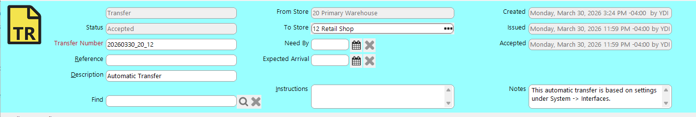 When a satellite location records sales or manual adjustments, its on-hand quantity will go negative. During the nightly maintenance process, Yellow Dog creates a transfer to offset the negative balance and return the on-hand quantity to zero.