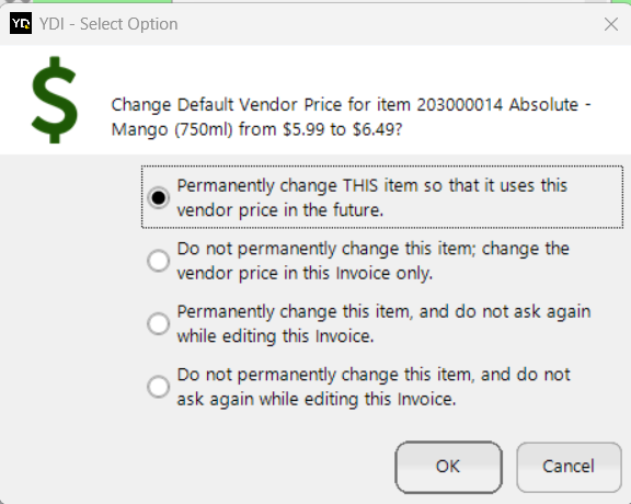 When you change a vendor price, Yellow Dog prompts you to choose how the change should be applied: