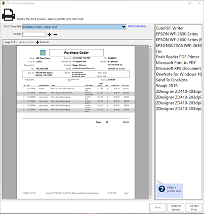 7. Select Email to Vendor: (as a note this feature requires Windows 10 and for the PO to be committed)