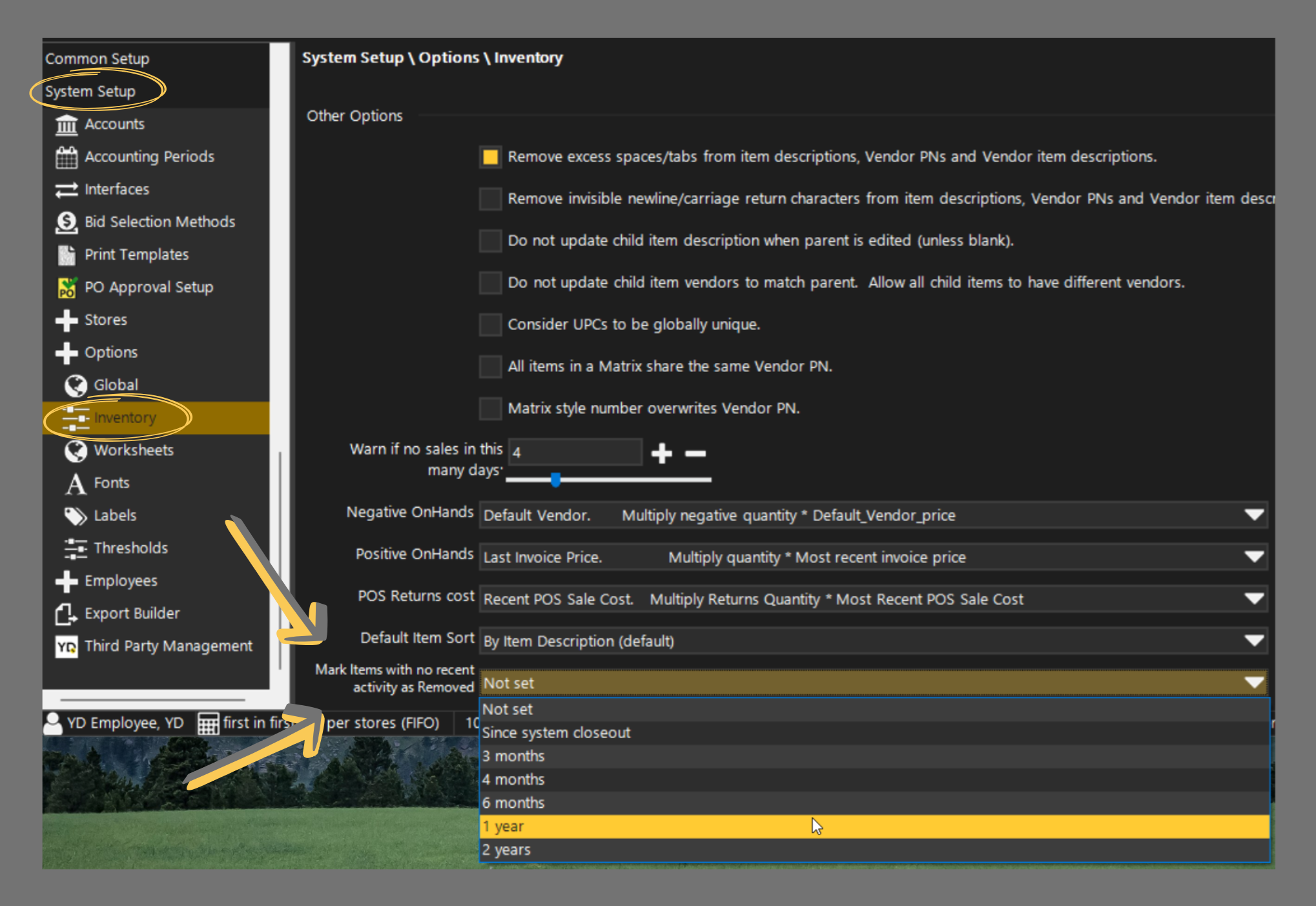 With the system option "Mark Items with No Recent Activity as Removed" you can set inventory to automatically be removed from inventory that haven’t had activity within a selected data range. This helps keep your item list clean by hiding products that are no longer in use.