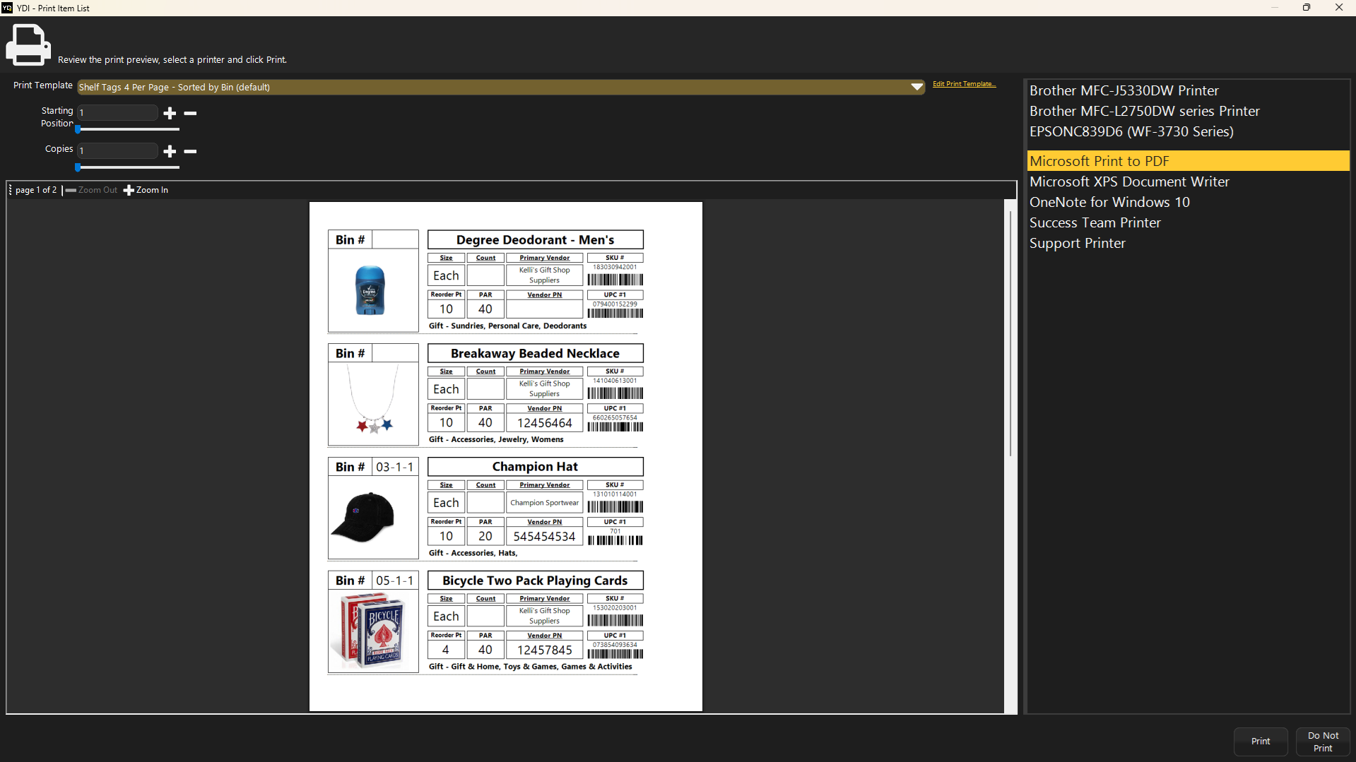 - Use the Print Template dropdown to select the print template Shelf Tag 4 Per Page - Sorted by Placement (default).