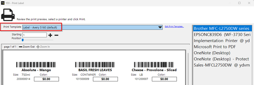 - When the Print Preview Screen opens navigate to the Print Template Drop Down at the top of the page and select ‘Label – Avery 5160(Default)’. You'll note each item in the queue is added to the sheet one time.