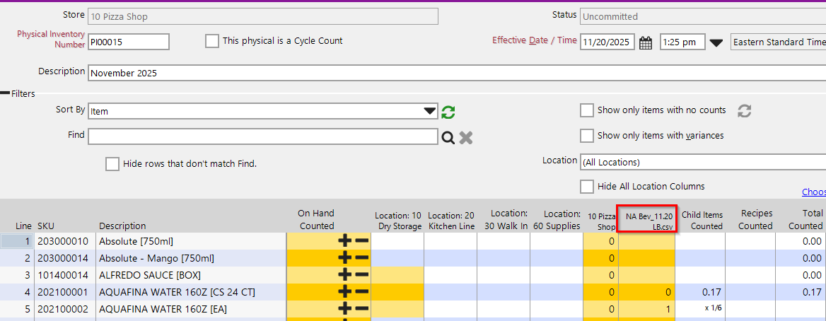 Figure: Example of a Physical Inventory with a session included that was imported as a CSV file