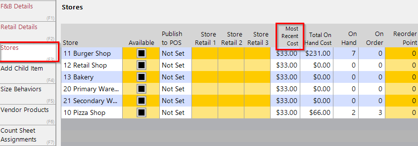 Figure: Example of the most recent cost column in the stores tab of the item editor