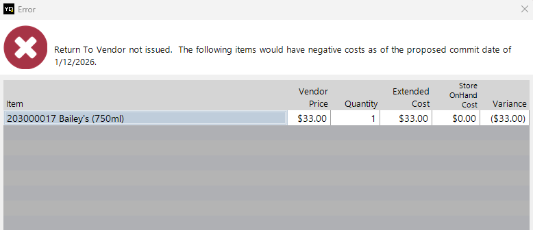 Troubleshooting: Negative Cost Popup on Return to Vendor