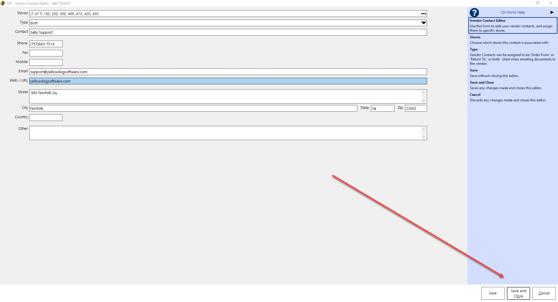 - Select which store(s) you would like this contact to be affiliated with, enter whatever contact information you have, and in the type drop down select Order From Contact, Return To Contact, Both, or Unknown. Once information is entered select Save & Close.